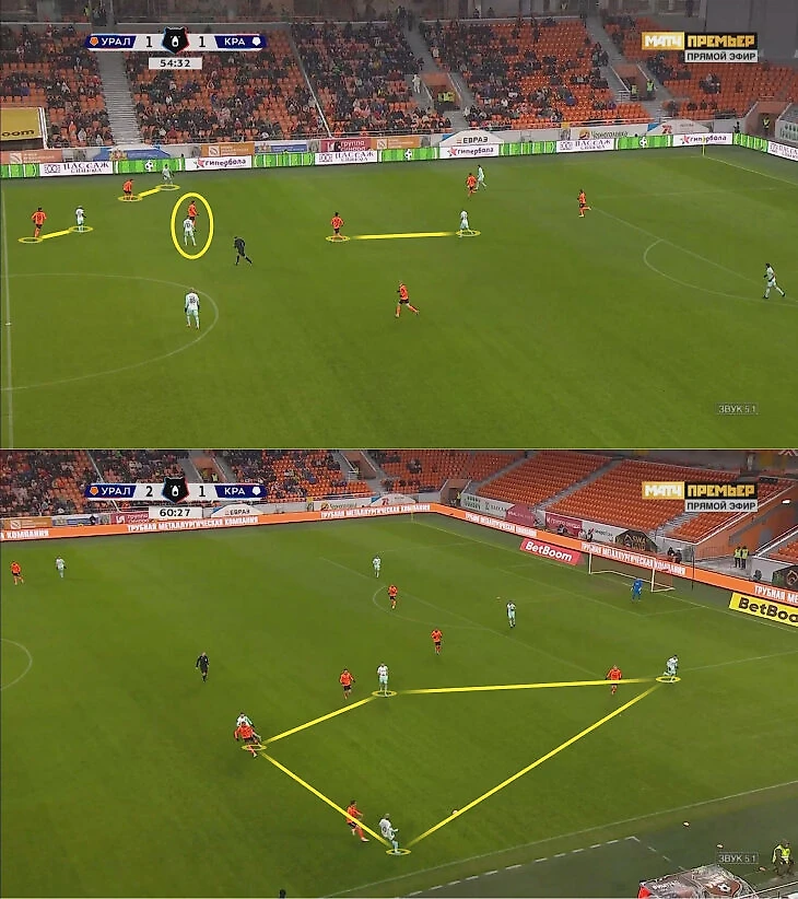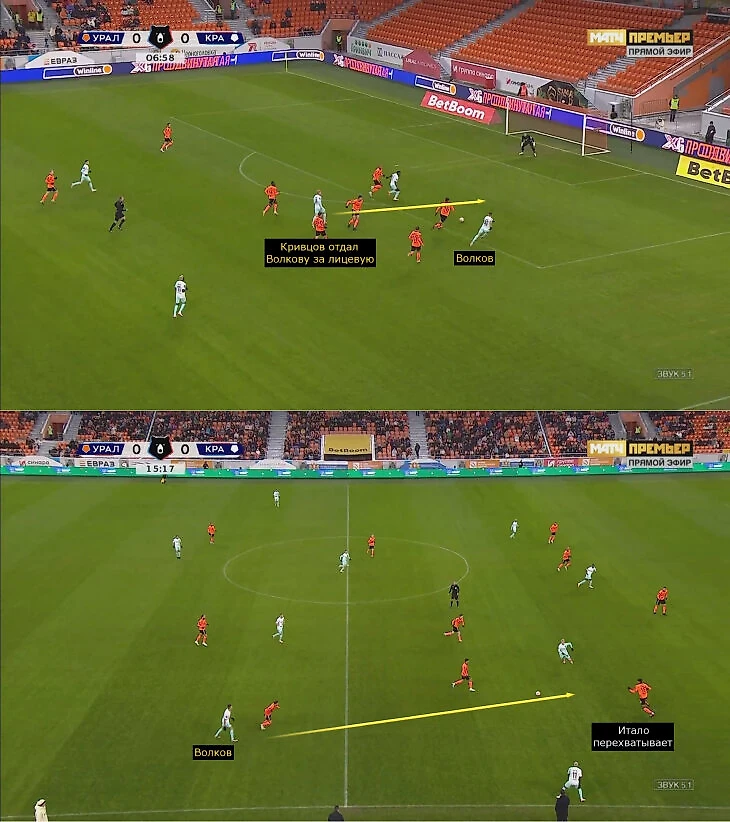 С «Уралом» в первом тайме «Краснодар» атаковал треугольниками в 4-3-3: Оласа (глубинный плеймейкер) – Сперцян – Олусегун (постоянная позиционная ротация), Волков – Кривцов – Баши. Единственный удар в первом тайме пришел после комбинации слева (конвертировался в гол), но в остальном «Урал» блокировал Сперцяна и Олусегуна. Справа – кошмар. Много брака в передачах и приеме, да и Волков – явно не про умные пасы вперед.