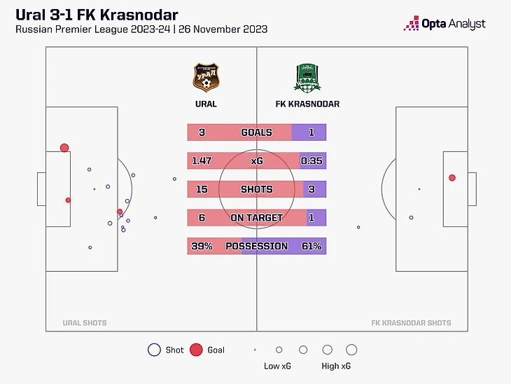 При 57% владения «Краснодар» уступил в передачах на чужой трети и по касаниям в штрафной, потому что «Урал» перекусил края и сбивал темп.