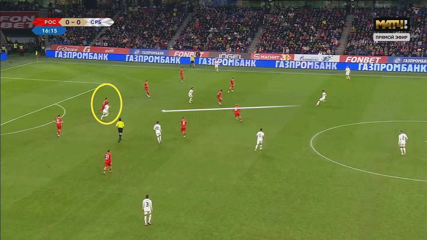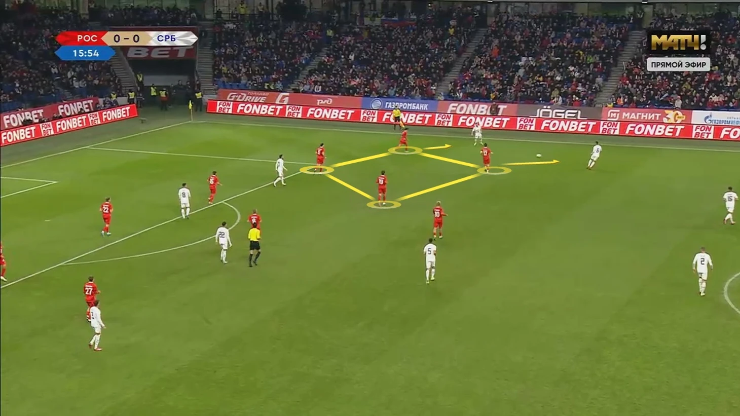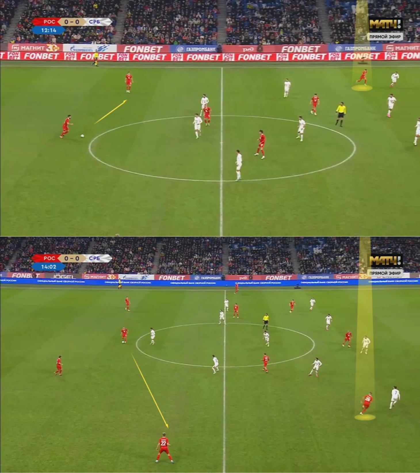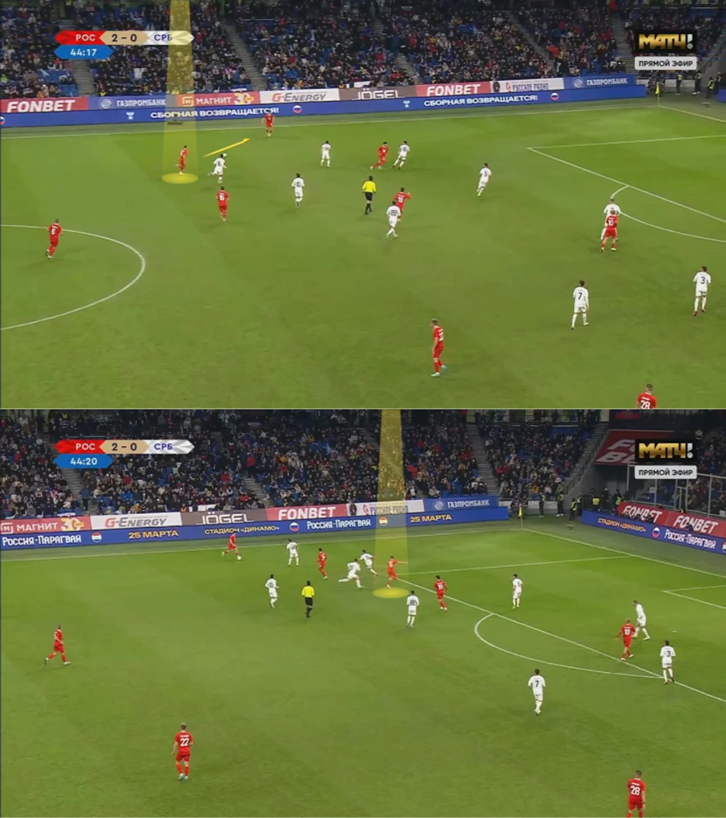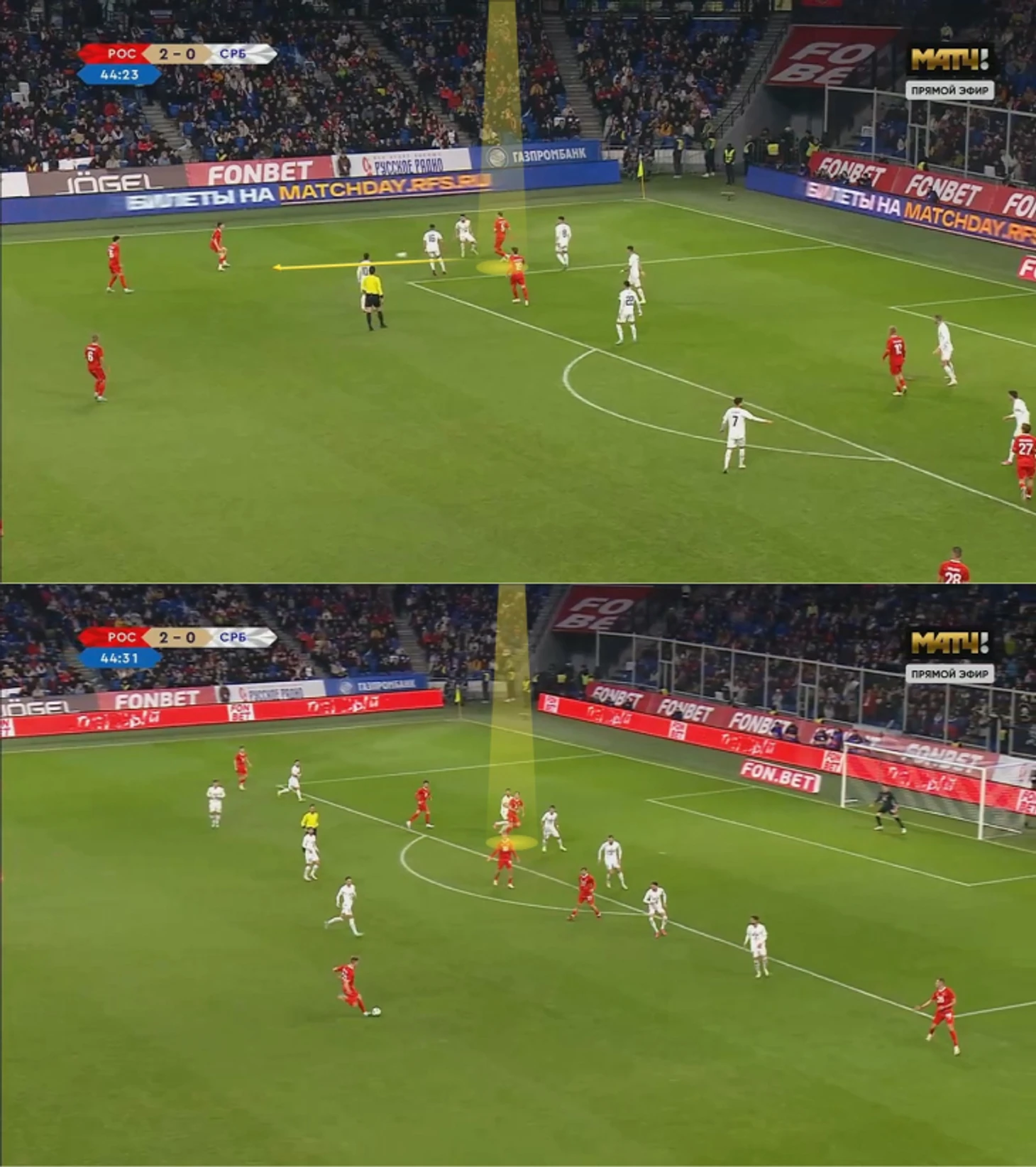 а) Россия блокировала фланги. Хлусевич – Миранчук – Головин создавали плотность слева, Волков – Баринов – Обляков справа. Периодически Сербия играла назад из-за отсутствия вариантов, Россия отвечала прессингом, в результате вратарь безадресно выносил нашим защитникам.