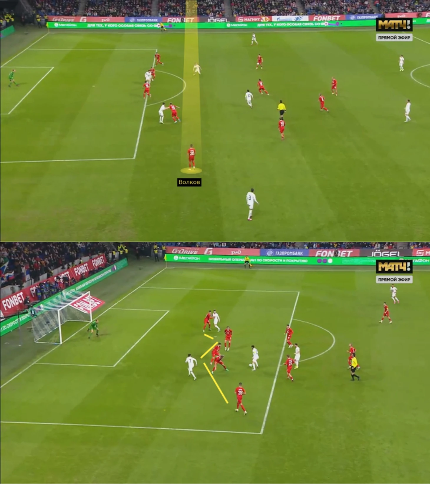 Еще планировались забегания Хлусевича и Волкова за спину: Головин и Обляков освобождали им фланги, когда заходили в середину. Плюс туда же вбегал Тюкавин и даже Головин (чуть-чуть не хватило до момента на 8-й минуте). Но глобально без остроты – большинство рывков в пустоту.