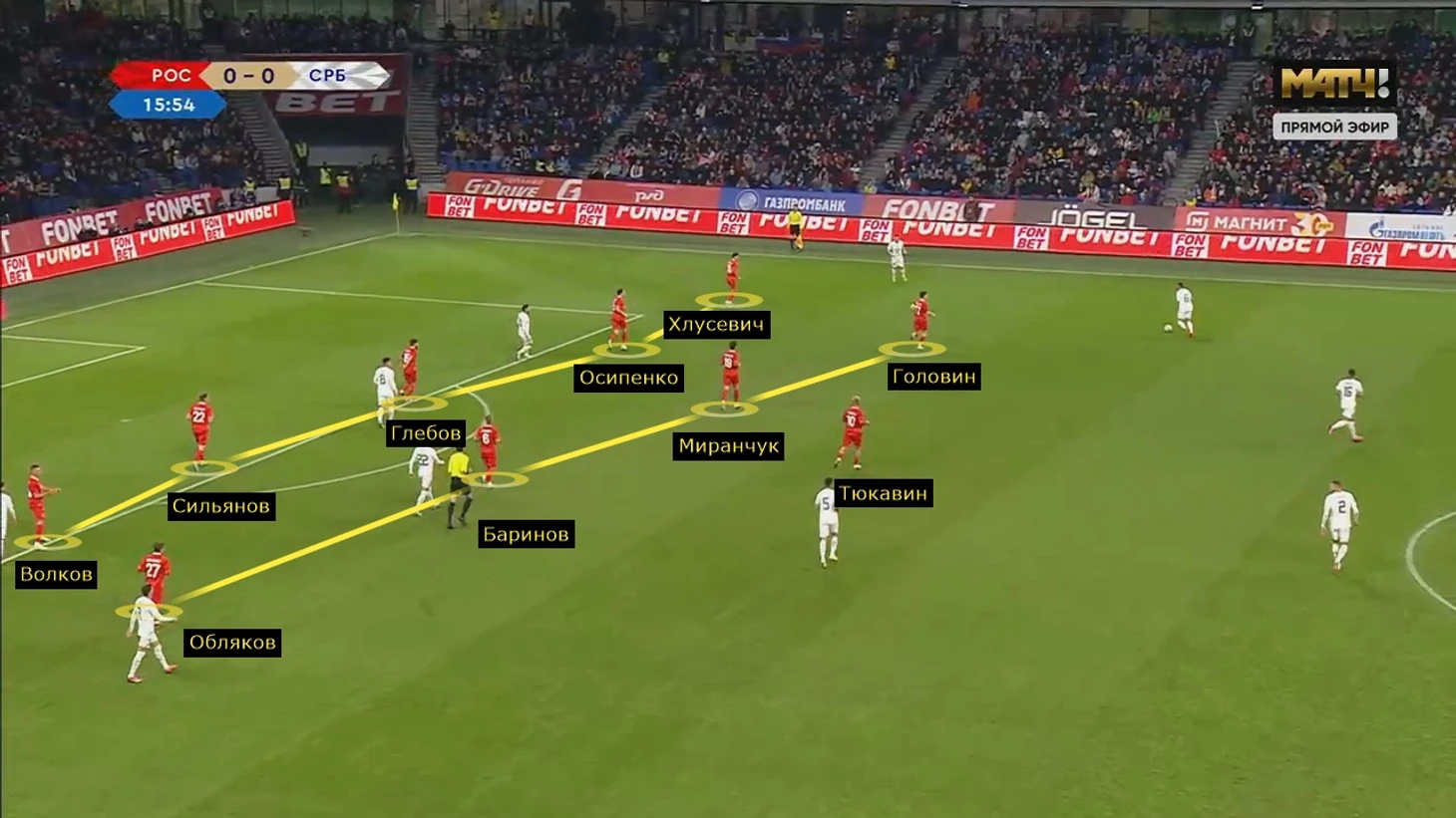 Принципы прессинга понятны: Тюкавин прихватывал опорника, вингеры ориентировались на центральных защитников, Глебов – Баринов – Миранчук располагались на одной линии и контролировали ширину (например, крайних защитников Сербии атаковала восьмерка), а защитники поддерживали компактность и располагались высоко.