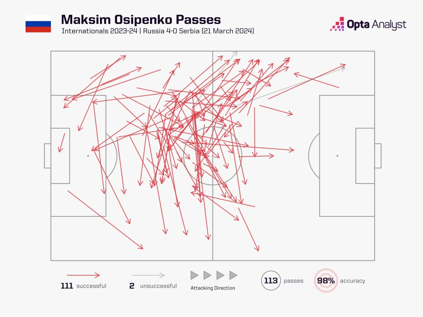 Максим Осипенко сделал 111 точных передач из 113. По данным Opta, предыдущий рекорд сборной – 109 передач Игоря Денисова против Греции на Евро-2012.