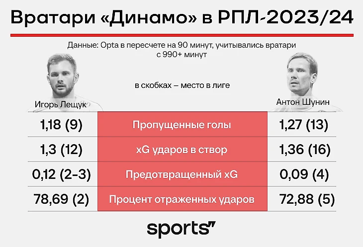 По статистике нет никакой катастрофы: вратари «Динамо» – середняки, но Лещук и Шунин пригодны всего к одному режиму. Оба набивают цифры без давления: отдают передачи ближнему (в этом сезоне не так много команд прессингует до вратаря) или выносят вперед.