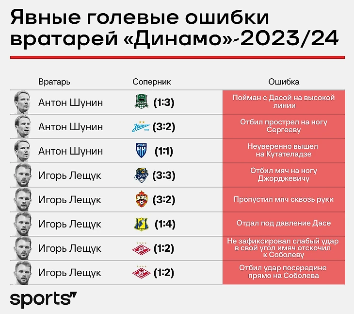 В этом сезоне Sports постоянно рассказывает об оборонительных проблемах «Динамо» (раз, два, три, четыре). Обычно мы писали о недоработках защитников, центральных полузащитников и вингеров. Теперь время разговора о вратарях: действия Игоря Лещука в матчах с «Ростовом» (1:4) и «Спартаком» (1:2) практически исключили «Динамо» из чемпионской гонки.