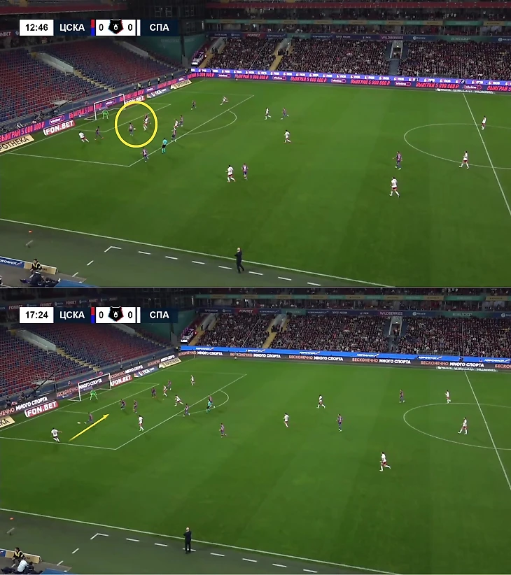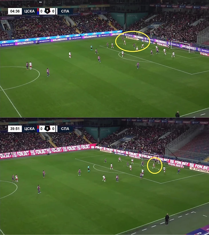 Полгода назад ЦСКА разрывал фланги включением латералей, так как защитники «Спартака» располагались узко, а вингеры не отрабатывали назад. Слишкович сохранил 5-2-1-2 в обороне и практически обезопасил себя от реактивных включений Гайича и Хелвена.