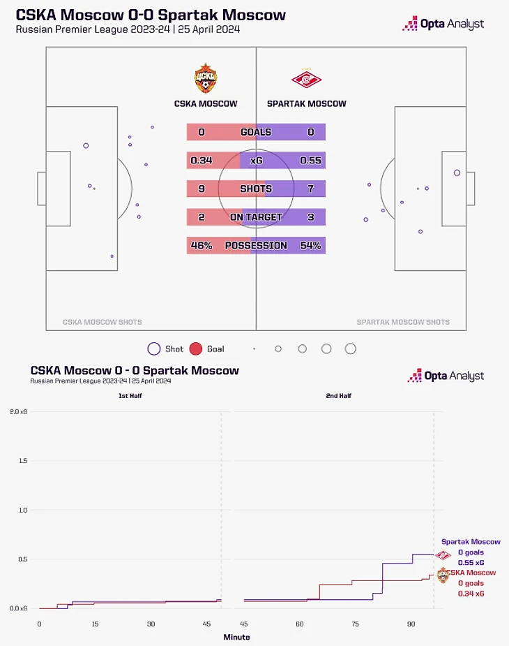 Момент Облякова после привоза Хлусевича – вне логики матча. В остальном команды не показали ничего интересного: 7 ударов из штрафной (только 4 с игры), это худший матч «Спартака» по ударам в сезоне (7), первая попытка в створ пришла на 80-й минуте.