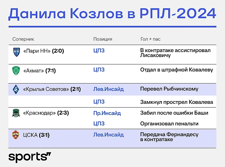 Козлов – главное открытие весны. Андрей Аршавин считает, что Козлов – уже топ, несмотря на юный возраст. С этим сложно спорить: атакующий потенциал точно перевешивает недостатки сзади (пока Даниле не хватает цепкости и дисциплины).