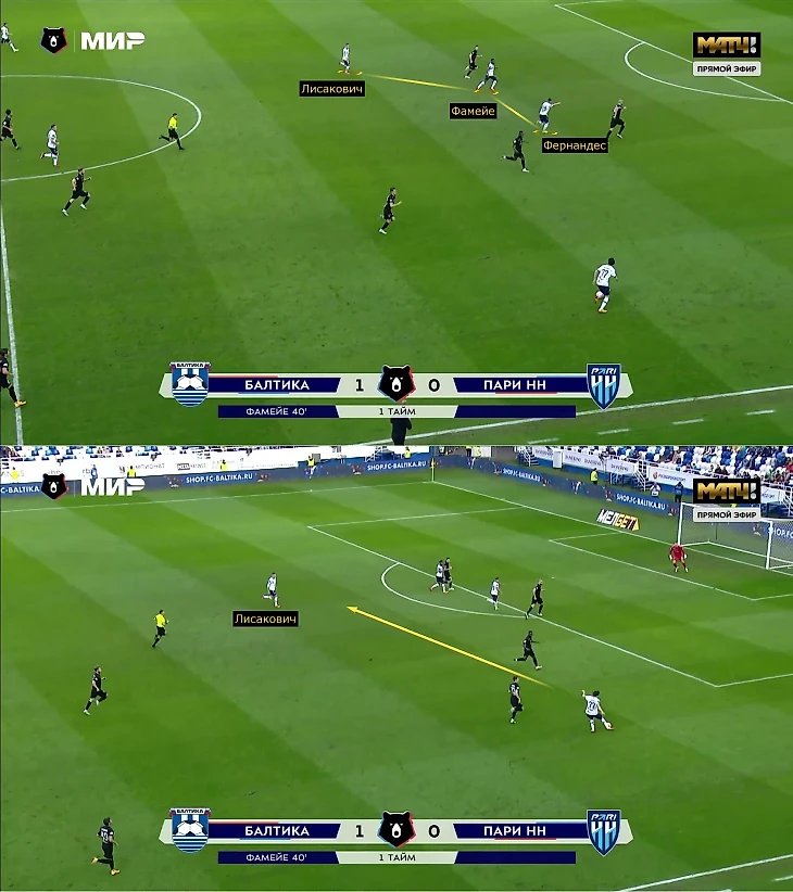Козлов постоянно высматривает партнеров в оптимальных позициях и никогда не торопится. Например, Данила топово разобрался с «Пари НН»: запрессинговал Каккоева и нашел Лисаковича. У Козлова наверняка был соблазн запустить сложную передачу убегающим Фамейе и Фернандесу, но Данила дождался смещения Лисаковича и образования зоны между ним защитниками.