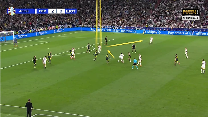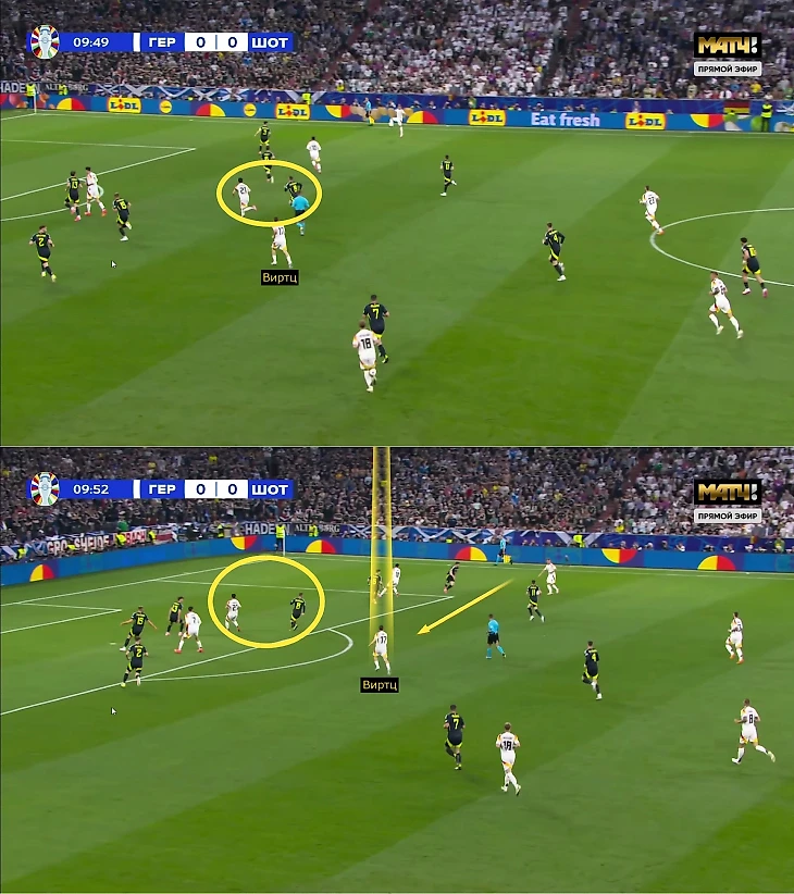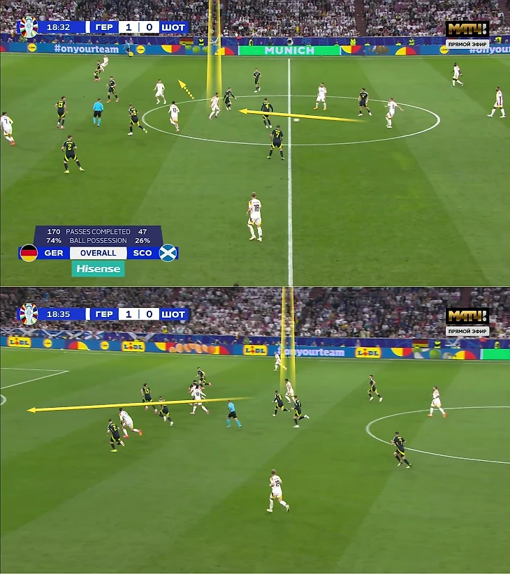 Гюндо органичен во всем: отскакивает между линиями, обыгрывает и сам двигает мяч в опасные зоны – так Германия забила второй гол Шотландии. Изначально Илкай был под опекой, но своевременный шаг вперед помог принять мяч даже с оппонентом за спиной. И дальше сместиться в оголенный полуфланг.