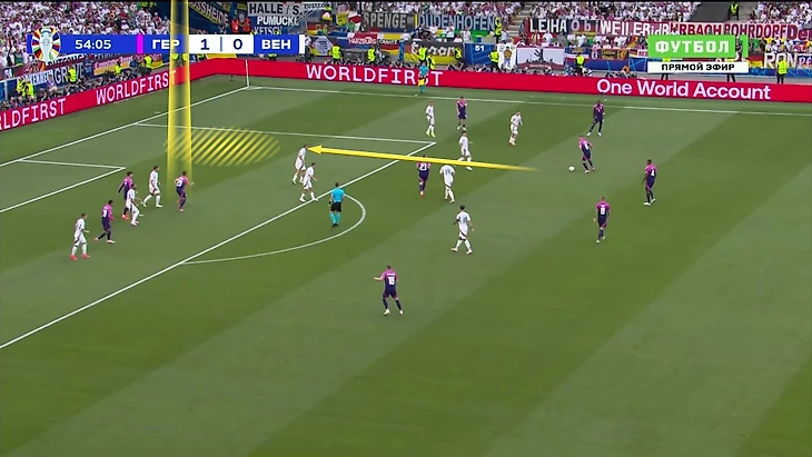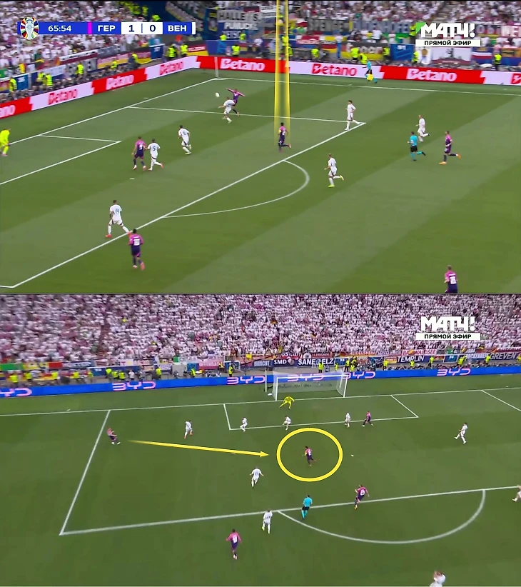 Шикарный момент против Венгрии: Киммих только посмотрел в свободную зону, а Гюндоган в ту же секунду там оказался. Очень полезно: промедли Гюндоган, Венгрия успела бы закрыться.