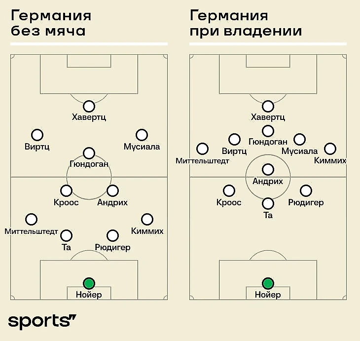 Против Венгрии она осталась прежней. Гюндоган, Мусиала и Флориан Виртц – десятки Юлиана Нагельсманна, но Илкай – ключевое вспомогательное звено. Он помогает Мусиале, Хавертцу и Виртцу, эффективен в одиночном режиме, при обороне настраивает прессинг и периодически вручную управляет партнерами.