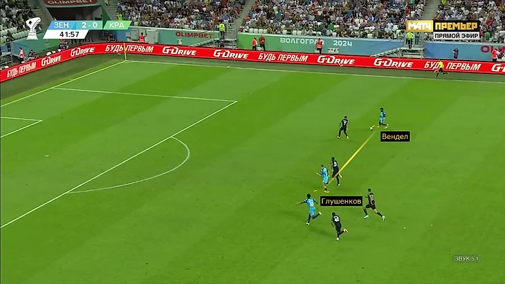 ● Ротация с Венделом. Это части сделки по свободе Глушенкова. Он приходил в середину, а Вендел поддерживал ширину. Во-первых, полезно для комбинаций справа. Во-вторых, Макс непредсказуемо разворачивается и бросает Андрея Мостового в проходы. В-третьих, «Краснодар» терялся в опеке на пространстве: например, в третьей голевой атаке Вендел и Глушенков разобрались за четыре касания, а формально левый защитник Ленини остался далеко за их спинами.
