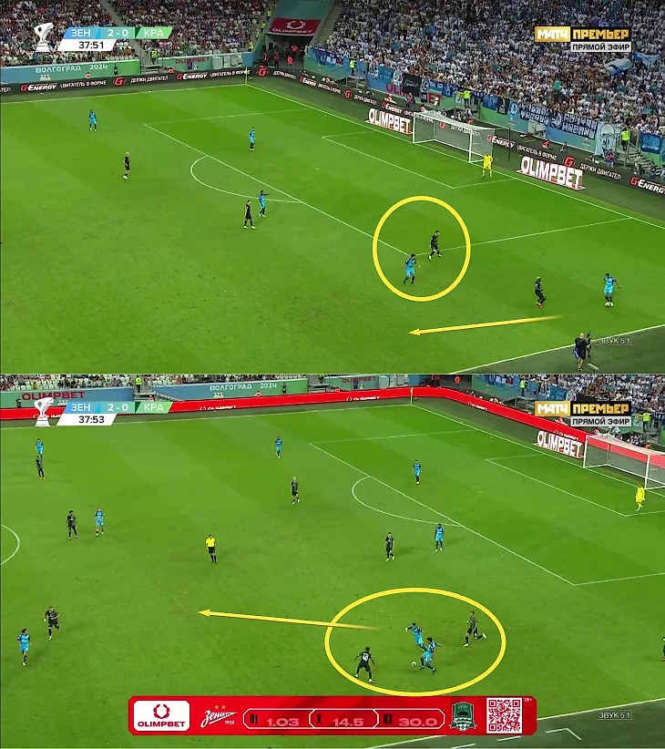 Второй – в стиле прошлого сезона. «Зенит» слегка расслабился из-за разгромного счета, «Краснодар» реально заиграл лучше, перегрузы опорной зоны сработали. Плюс классно сыграл Кривцов: полезно включался, технично положил в дальний и обокрал Вендела.