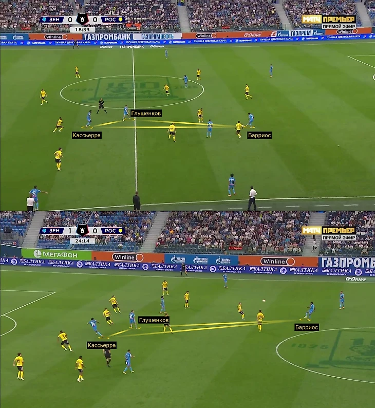 Первая – разрезала «Ростов» после волны прессинга (шикарный подыгрыш Кассьерры в глубине, увел за собой центрального защитника Умара Сако), вторая – тонкий заброс на Матео, разбивший компактные 5-4-1 команды Карпина.