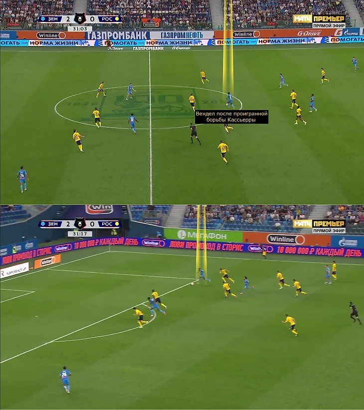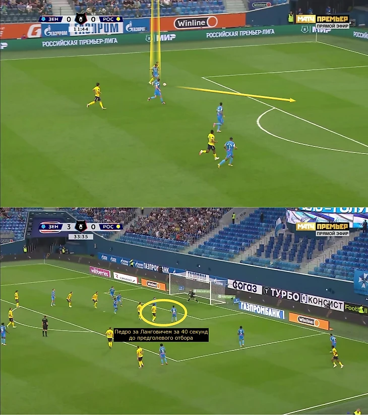 Стартовый прессинг «Ростова» – иллюстрация, почему «Зенит» интересуется большими нападающими. Команда Семака выманивала «Ростов» в прессинг, но не цеплялась после длинных передач. Кассьерра боролся, но Сако справлялся.