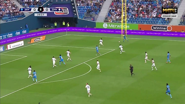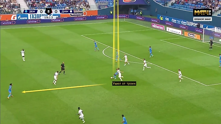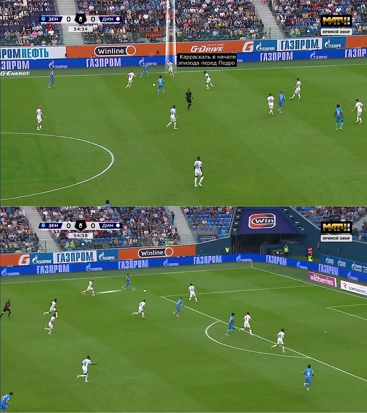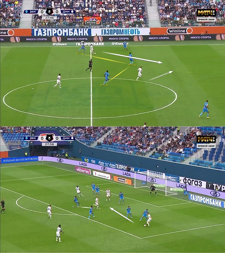2. Под розыгрыши от ворот 4-2-3-1 «Динамо» накладывались на 4-3-3 «Зенита» из-за персоналки в полузащите и давления вингеров на крайних защитников.