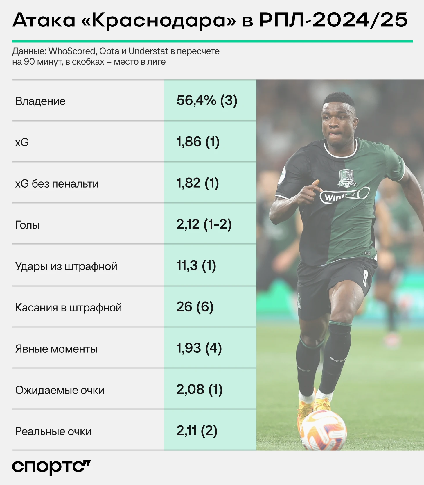 Так «Краснодар» стал главной атакующей силой лиги: оторвался по xG без учета пенальти (29,14, ближайший преследователь – «Спартак» с 25,88) и ударам из штрафной (182, у «Локо» – 166).