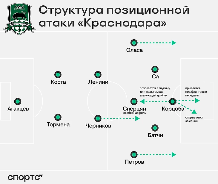 ● Против раскрытых соперников или слабых команд «Краснодар» разыгрывает через середину благодаря Черникову/Кривцову, агрессивным включениям крайних защитников и свободным ролям атакующей четверки (ключевые – Кордоба и Сперцян, а Батчи и Са бегут за спину или подыгрывают).