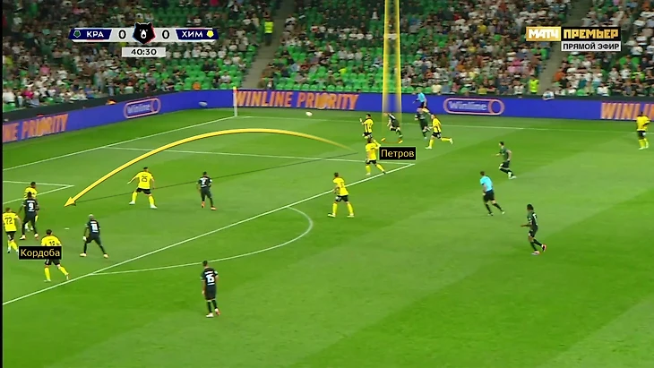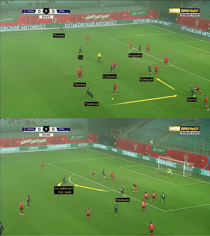● Благодаря тем же механизмам «Краснодар» организует кроссы: полузащитники и инсайды выводят крайних защитников на подачи, в рамках которых опасны Кордоба и вбегающий опорник Черников.