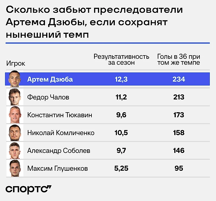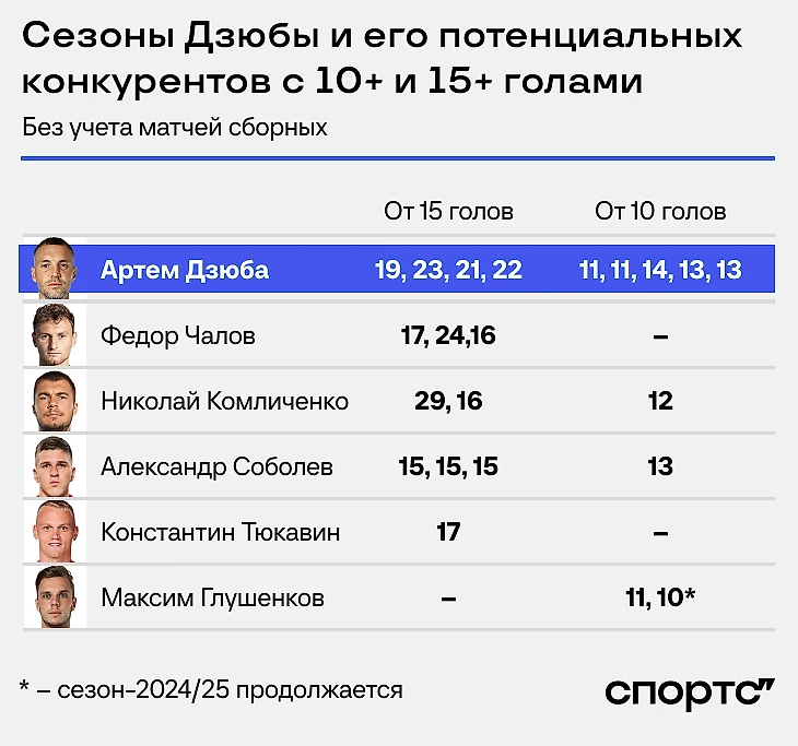 Все просто: никто из потенциальных конкурентов Артема не подобрался к стабильным 12 голам за сезон. Чтобы погнаться за Дзюбой, необходимо еще и мощно прибавить в реализации: рекордсмен четырежды пробивал 15+ мячей за сезон (в сумме – 85, это чуть меньше, чем у Чалова, Соболева и Комличенко за всю карьеру) и стабильно выбивал 10+, тогда как его конкуренты не удерживали пиковую результативность.