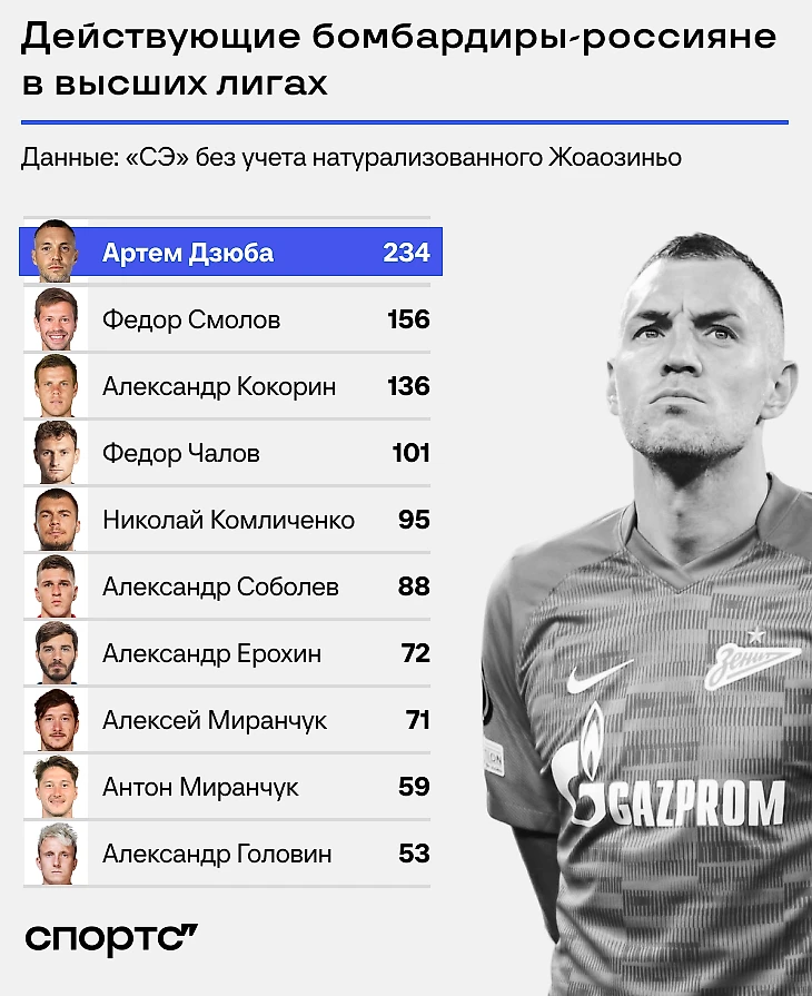 Это значит, что достижение Дзюбы, несомненно, историческое. В ближайшие годы к нему и Кержакову никто не подберется: 35-летний Федор Смолов максимум обгонит Сергея Родионова со 164 голами, почти 34-летний Кокорин может не достать и до 150, а остальные не разменяли и 100 мячей.