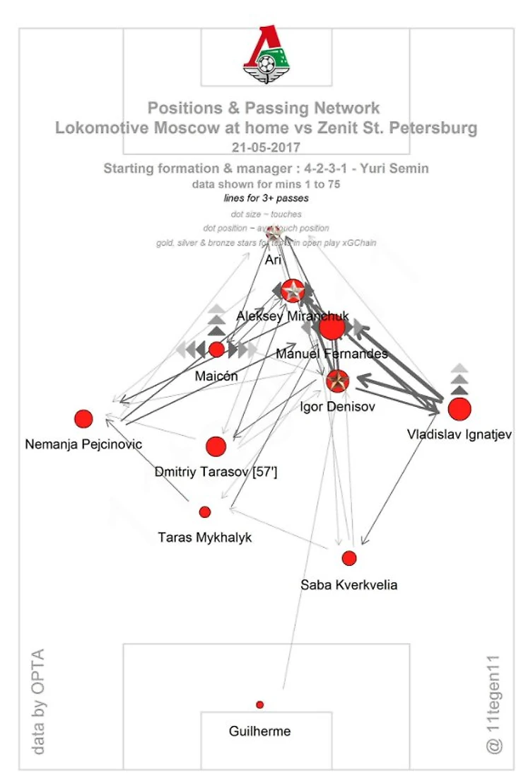 На схеме: чем толще стрелка – тем больше передач было между игроками. Чем больше круг – тем больше касаний он совершил.
