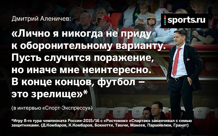 Криминальные детали матча 8-го тура против «Ростова» также указаны на картинке: cемь красно-белых защитников. Пожалуйста, можете сколько угодно называть автора хейтером – я лишь тот, кто смотрел все матчи «Спартака» Аленичева, чтобы попытаться воочию обнаружить в этих многочисленных играх хоть капельку соответствия тренерским басням об атакующем футболе. Извините, но факты говорят сами за себя. Я честно выполнял свою работу.