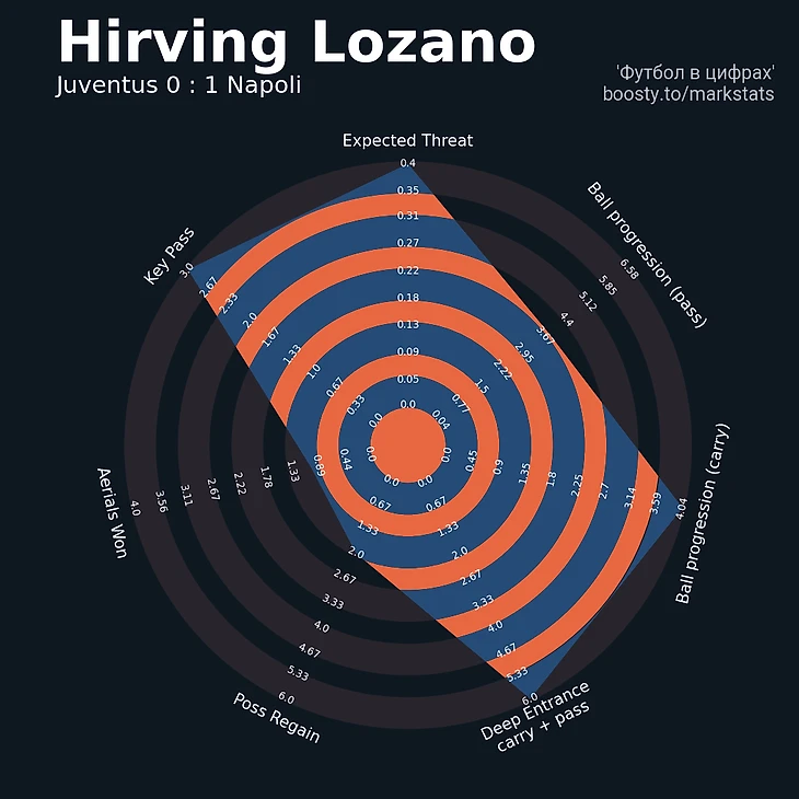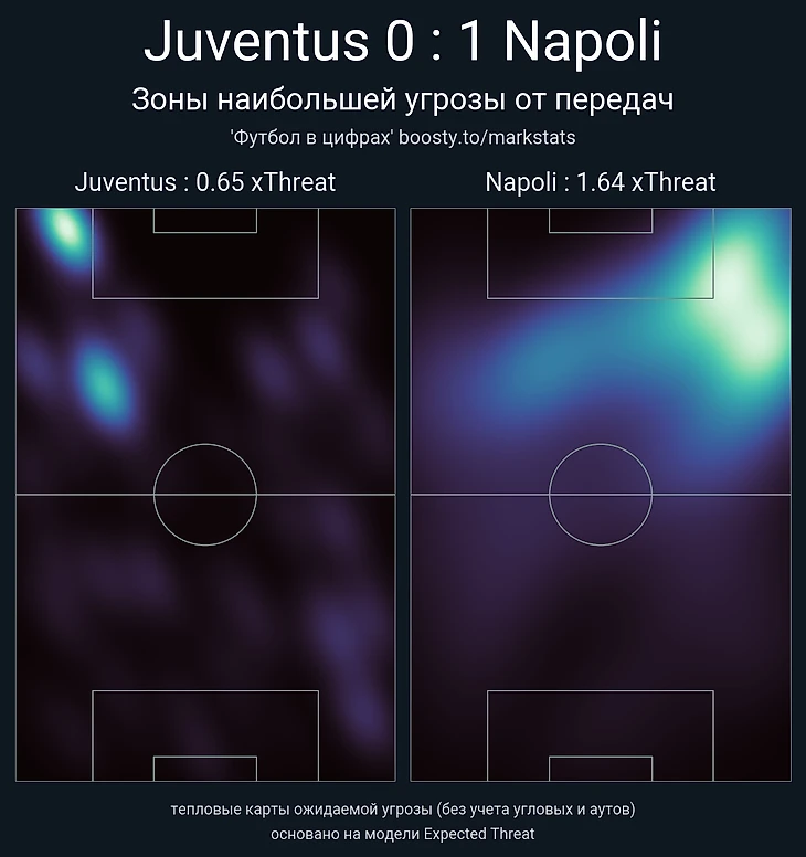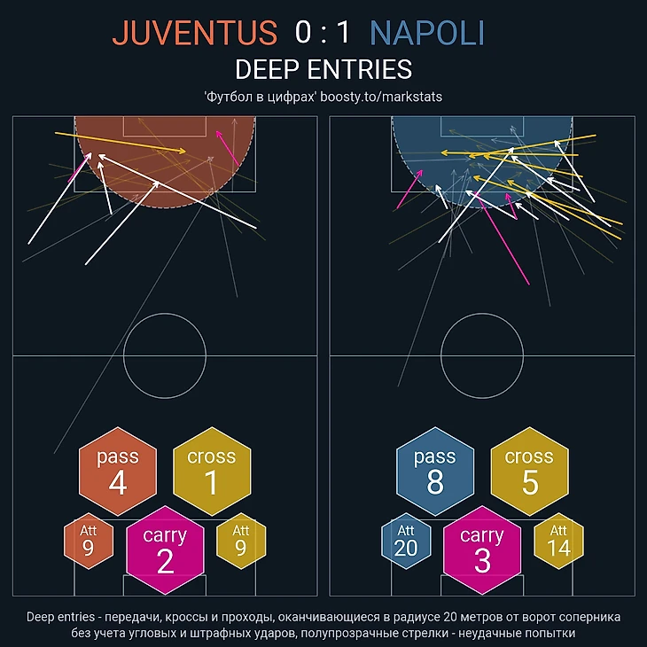 Новшество, учитывая показатели по ходу сезона. В итоге тандем Ди Лоренцо и Лосано набрал почти единицу по xThreat, в то время как пара Хвичи и Оливера около 0.2. Для пущей убедительности смотрим на карту deep entries.