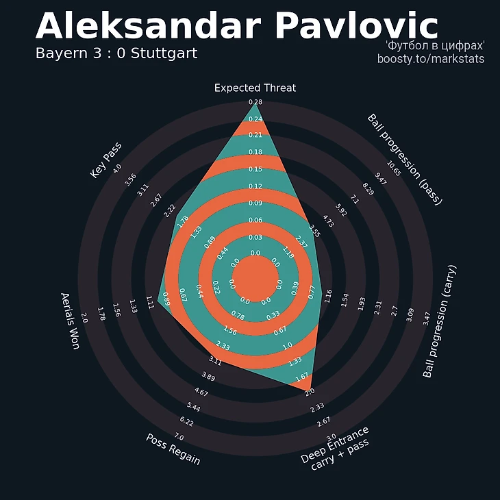 Приятное впечатление оставил Павлович. Он заметно заматерел на позиции опорника, и это в условиях, когда у тебя в конкурентах по позиции Киммих и Горецка, а твои боссы ратуют за трансферы, с целью укрепить твою же зону. Александр был монументален как ЦПЗ, но отметился и в качестве созидателя. Он отдал предголевую, когда Кейн оформлял дубль, и он же навесил на Кима при третьем взятии ворот! Взгляните на его сбалансированный многоугольник силы.