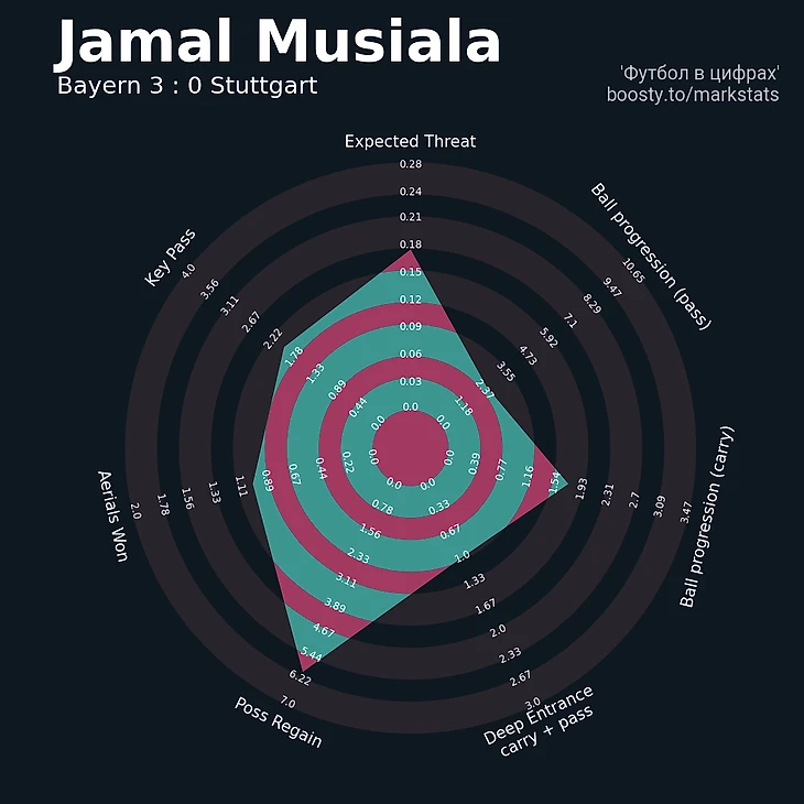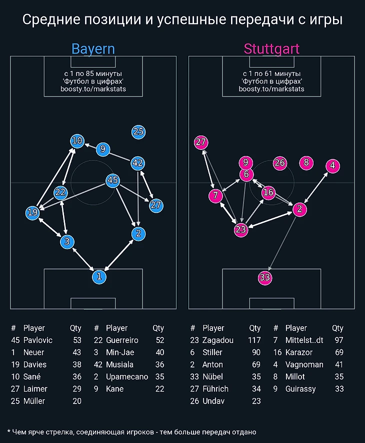 «Штутгарт» не создал вообще ничего. При всём желании найти позитив хотя бы в одной линии или даже игроке, эта попытка будет тщетной. Хёнесс либо переоценил свои силы, либо хотел запутать Тухеля выбором двух ЦЗ. Вероятно, он вдохновился хитрыми шаблонами Дино Топмёллера, у которого получилось обойти наставника «Баварии» в играх разума, но в этом матче уже сам Томас проявил опытность и хладнокровие: лично вручил Себастьяну мяч и владение, которыми его подопечные не смогли воспользоваться. Итоговое владение 38%–62%, итоговый xG 2,9–0,18…