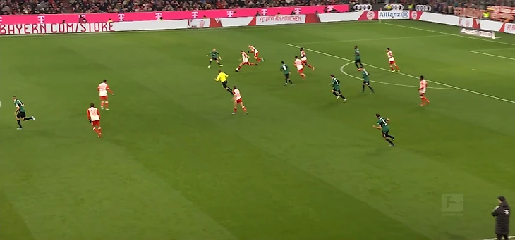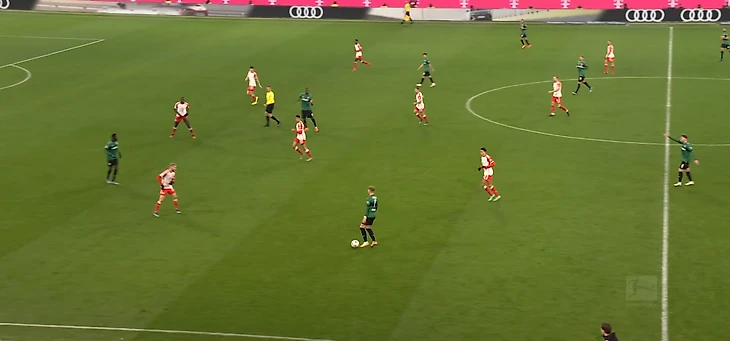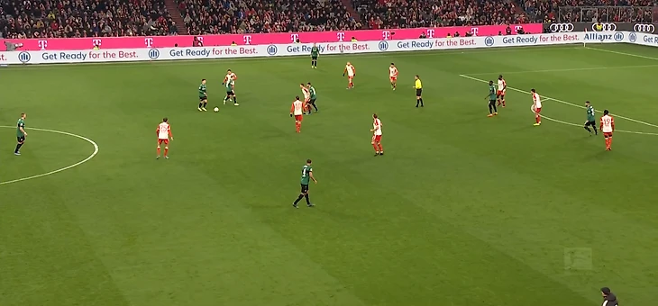 «Бавария», памятуя о том, как отсутствие персональных ориентировок погубило их в матче с «Айтрахтом», на этот раз действовала чётко по игрокам. Взгляните на иллюстративный пример обороны хозяев на 43-й минуте: здесь имеют место как covering shadow (Кейн, Сане, Ким и Лаймер), так и плотная опека по персоналиям (Павлович, Мусиала, Дейвис, Упамекано). Характерно и то, как низко садится вся команда: выше линии мяча лишь Мюллер.