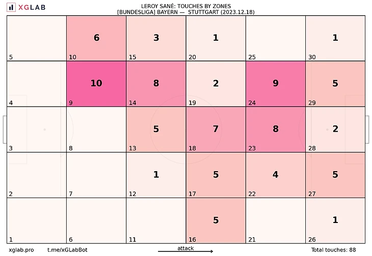 «Бавария» продолжила уверенно контролировать игру, не владея мячом. Это был осознанный шаг, ведь команде вполне комфортно действовать после отборов, разгоняя атаки через центр. Матч стал настоящим бенефисом Лероя Сане. Вингер по ходу сезона набрал лучшую форму, из когда-либо у него имевшихся, однозначно входя на данный момент в тройку сильнейших на своей позиции в мире. Вот пример его вездесущности во вчерашнем матче.