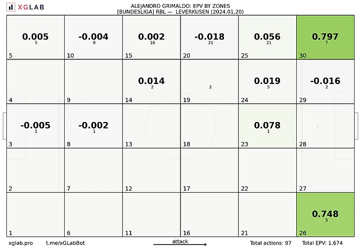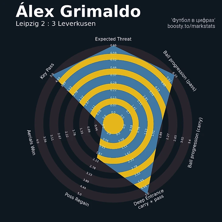 Гримальдо просто невероятен. К уже упомянутым EPV-показателям прибавьте 86% точности паса, 20 передач в финальной трети, 8 с продвижением, 5 под удар и сразу 2 голевые! Совокупно Алекс набрал 0.66 xThreat (0.41 со стандартов).