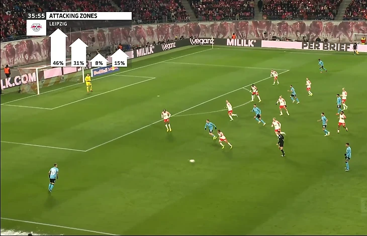 Слева каждый квадратный метр выгрызал фактурный Раум, а в подыгрыше своевременно участвовали Ольмо и Шлагер, мощно перегрузившие полуфланг на подступах к штрафной и в ней самой. Испанец так и вовсе на 29-ой смимикрировал под Альфонсо Дейвиса, практически повторив полулегендарный слалом канадца из матча с «Барселоной» (2:8). Правая бровка пустовала, но в полуфланговом коридоре со временем стал появляться Симакан. Тем не менее, крен налево был очевиден, а во втором тайме и вовсе закрепился в качестве единственного игрового нарратива: «Лейпцигу» попросту не давали продохнуть справа. Отсюда почти половина атак через левый край.