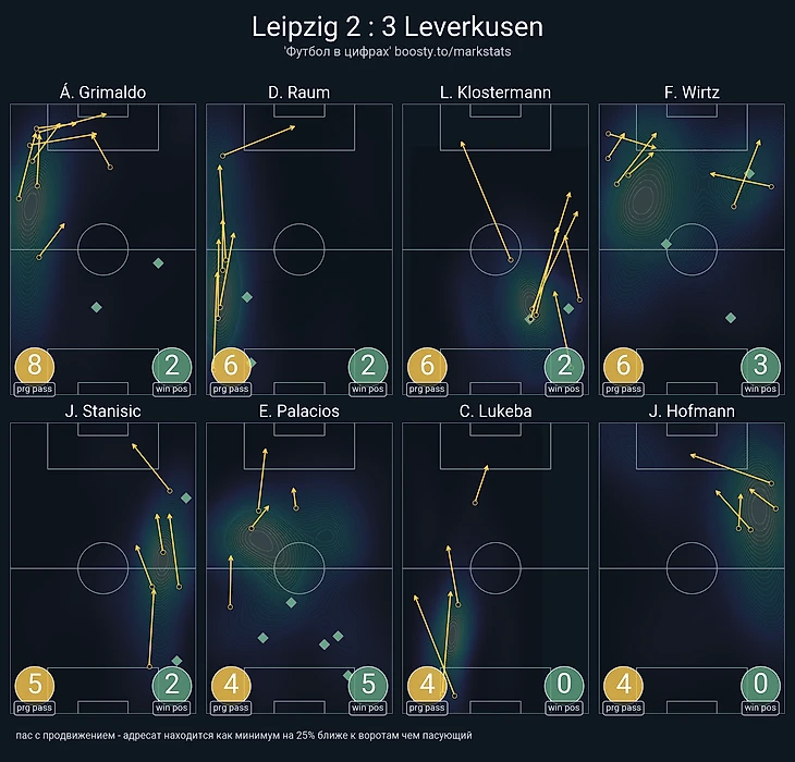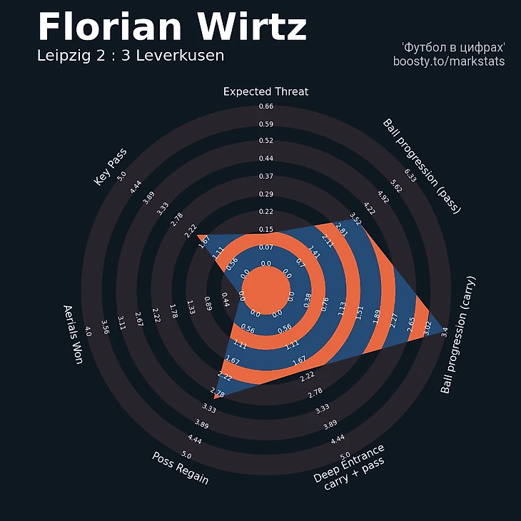 Вирц явно не солировал, но даже сугубо визуально оставил приятное впечатление по дриблингу и Progressive Carries. Цифры подтверждают: Флориан совершил 22 передачи в финальной трети, 6 с продвижением; трижды перехватывал мяч и трижды бил сам. Для примы, разумеется, маловато, но его неброская роль внесла неоценимый вклад в аннигиляцию «быков» при обороне. Опорники, как и защитники, проигрывали в тет-а-тет дуэлях с Вирцом.