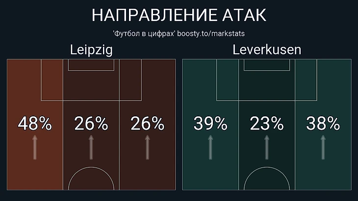 Как видно из инфографики, «Байер» тоже непривычно много для себя задействовал фланги, проведя совокупно менее четверти атак через центр. Но почему? Дело в том, что активное использование «быками» флангов в высокой позиции вынудило «фармацевтов» обороняться а) средним, а то и низким блоком б) делать это в центральном коридоре даже у своей штрафной. Следовательно, при перехвате мяча архитектура билд-апа строилась от имеющегося пространства, а оно было лишь по центру. Столь стеснённые условия вынуждали леверкузенцев эпизодически играть не в свой футбол. Например, в первом тайме гости были ужасны в переходной фазе между первой и второй третями. Тут у них абсолютно ничего не клеилось, особенно при игре без мяча. «Лейпциг» несколько раз ловил Джонатана Та и компанию на контратаках, закидывая им за шиворот передачи на Опенда и Симонса. Первый, к слову, был главным адресатом лонгболов, а ещё против него опасно играли в штрафной, но искомого Лои не добился – пенальти Маттиас Йолленбек так и не назначил.