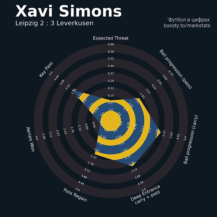 Что касается главной надежды хозяев в лице Хави Симонса, ему не так много позволялось, как могло показаться. Да, он исполнил акробатический этюд на 7-ой минуте, а кроме того разогнал голевую атаку «Лейпцига», но в сухом остатке мы видим лишь 30 попыток сделать передачу за игру, из которых только 22 достигли адресата (всего 8 в финальной трети). Вкупе с 0.1 очков по xThreat – не так, чтобы убедительно.
