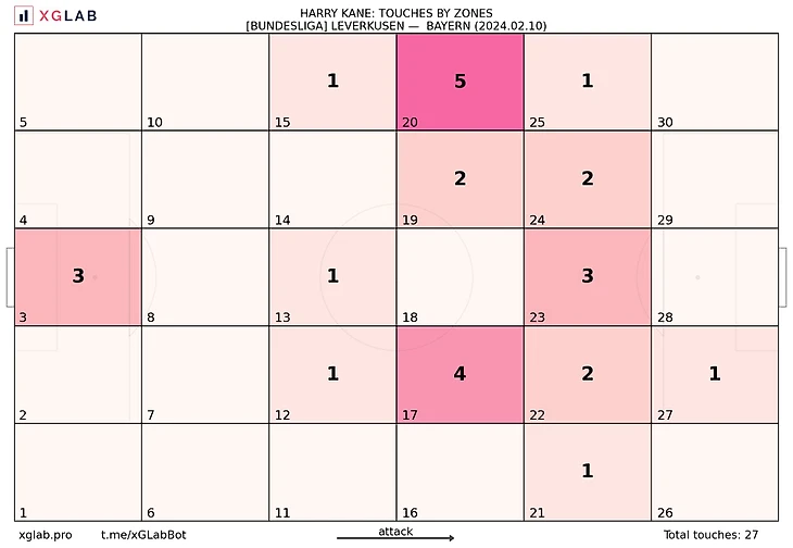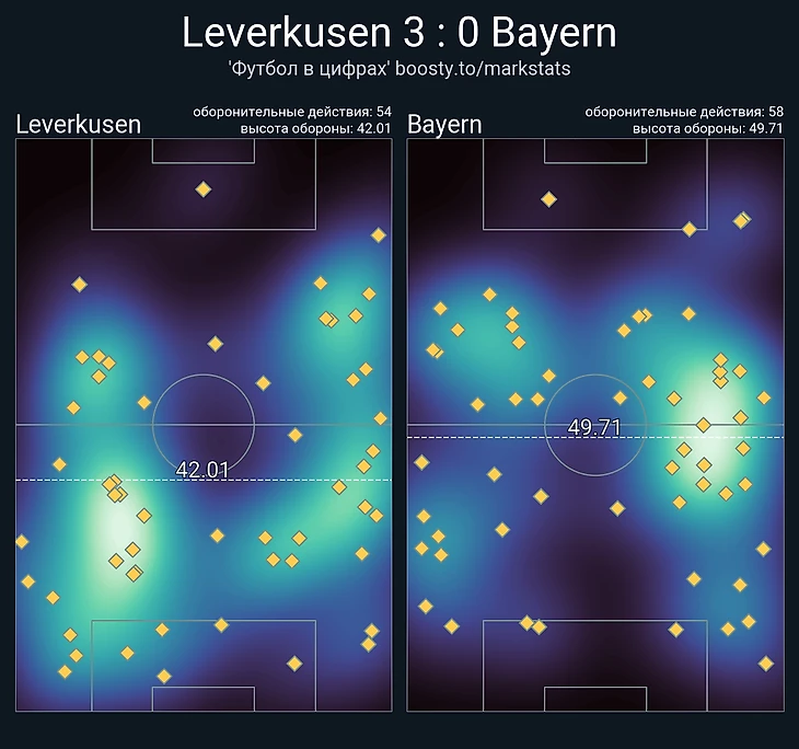 После 75-ой минуты «Байер» и вовсе играл в шесть защитников, наглухо перекрывая варианты по всему периметру как для Кейна, так и для вингеров. Видно, что это сказалось на общей карте оборонительных действий.