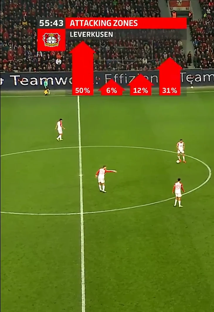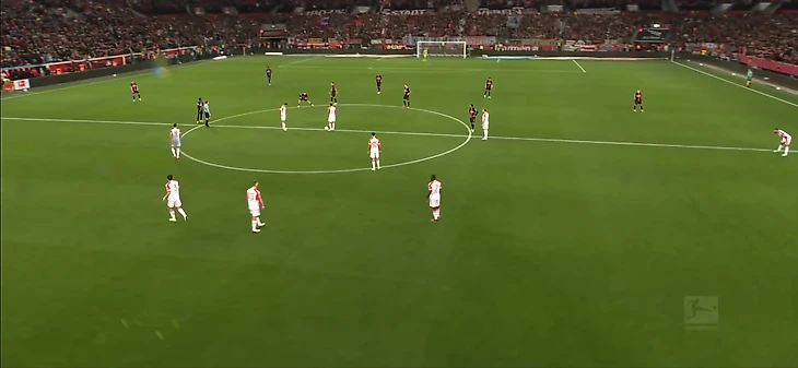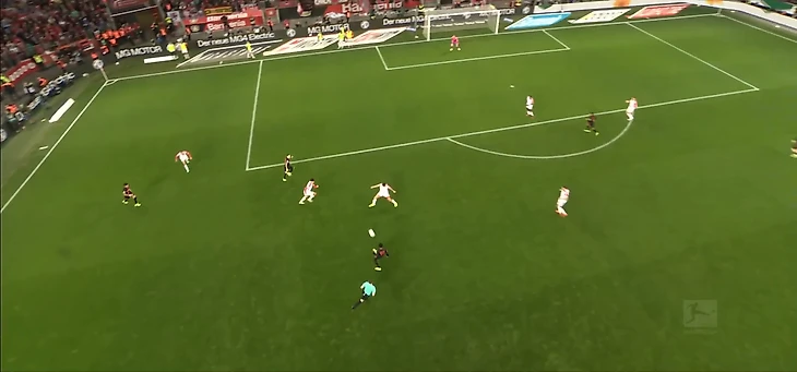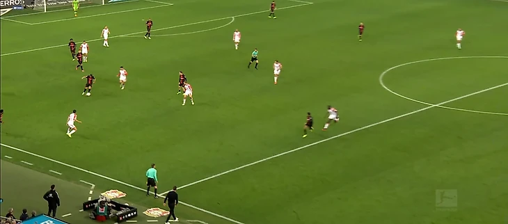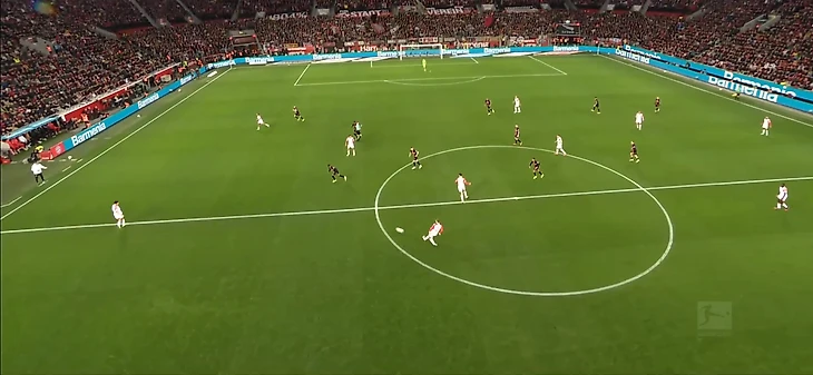 Главное действующее лицо хозяев в первом тайме, ожидаемо, Вирц. Флориан выступил в классическом для него амплуа назойливого плеймейкера + «ложной девятки». Функционал тоже сохранился практически весь: вингер совершенно не боялся идти в обводку даже в глубокой стадии атаки, здорово контролировал мяч на скорости, а главное – выполнял филигранные разрезающие передачи, регулярно заставляя баварских защитников чувствовать себя одураченными. Несмотря на умные пасы Вирца и голевую Андриха, лучшая передача первой сорокапятиминутки – вырез Джаки на Адли.
