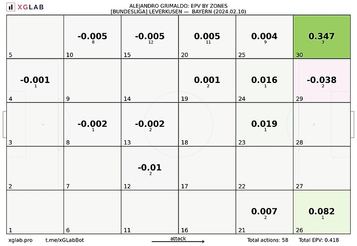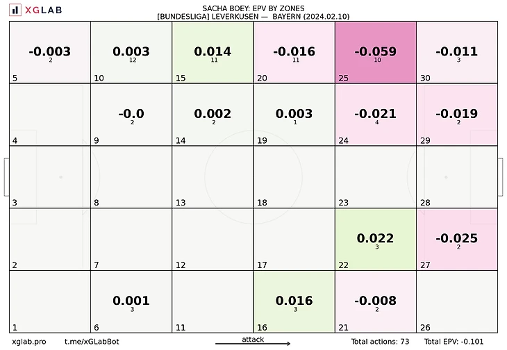 Разумеется, Хаби держал в уме тактические пертурбации Томаса. Более того, вполне вероятно, что испанец был готов не только к отзеркаливанию собственной формации, но и к выходу Буя в старте. А судя по тому, что наставник не выпустил Фримпонга, он ещё и мог догадываться о намерении Тухеля нивелировать скоростного Джереми не менее реактивным Буем. Как итог, Алонсо поверил в смелые решения визави (Буй в старте, да ещё и не на своём фланге), но был полностью готов к разрушению баварских альтернатив. Для француза догадливость Хаби оказалась фатальной: действия Саши в непрофильной зоне стали не только его головной болью, но и всех партнёров по левому краю, которым приходилось подчищать за новичком. Итоговый EPV Буя – катастрофа.