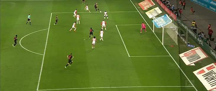 Из-за его же невнимательности «Бавария» пропустила первый гол. Конечно, унизительная передача между ног Упамекано бросается в глаза первым делом, но фактически «Байер» забил не из-за тройки Ким-Дайер-Упамекано (они как раз располагались позиционно верно), а по вине Саши, потерявшего с радаров Станишича.