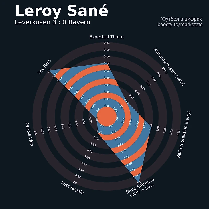 Спешные ротации Тухеля в последние 30 минут были кричащими: Томас признавал поражение в интеллектуальной дуэли с Алонсо, но главное – показал, что крепкий костяк ветеранов клуба сейчас для него не более чем кучка резервистов. Ни Киммих, ни Мюллер радикально не преобразили футбол «Баварии», пускай и несколько оживили. Сане получил чуть больше свободы, но не смог ей воспользоваться в оставшееся время. Лерой вообще часто ошибался в передачах: всякий раз он либо делал пас в пустую зону, либо в ноги защитников «Байера». Вот его итоговая диаграмма.