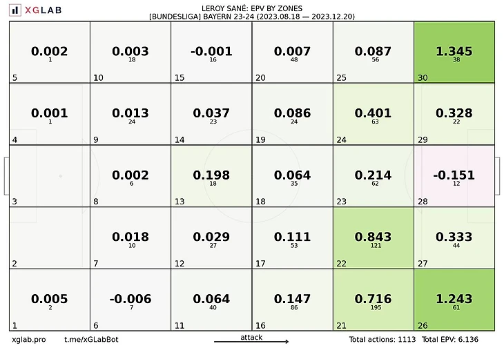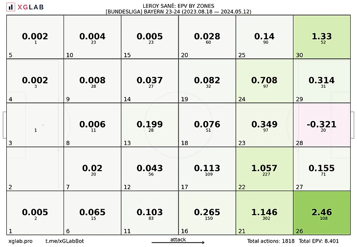 С одной стороны, он закрыл все проблемные в прошлом зоны – с отрицательными значениями осталась лишь 28-я. С другой – цена, которой он этого добился. Владение стало стерильным, особенно в родном правом полуфланге (там совсем беда – цифры лишь ухудшились). В 2024-м Сане прибавил лишь на два с половиной пункта – было 6.136, стало 8.401, а в чужой штрафной ухудшил свою ценностью обладания мячом более чем в два раза (хотя касаний совершил лишь на 8 больше). Что это, если не регресс?