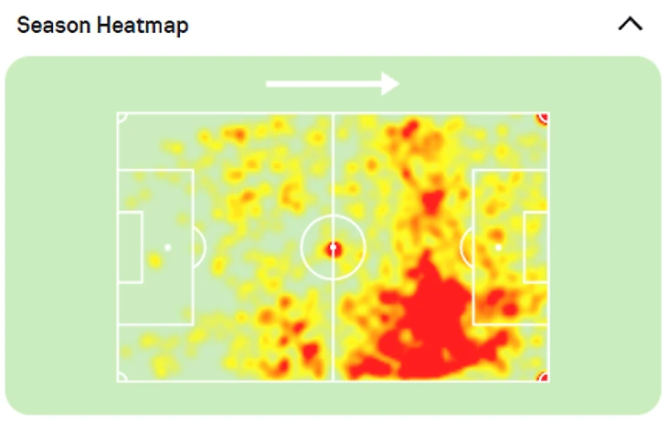 Сане – главный креативщик «Баварии» и мотор всех ее атак, он же главный доставщик мяча до Харри Кейна (когда не заигрывается), он же отвечает за вбегания в чужую штрафную на скорости. Тепловая карта вингера не только красноречиво отображает его значимость для всего правого края атаки мюнхенцев, но и указывает на серьезную вовлеченность футболиста в оборонительную работу.
