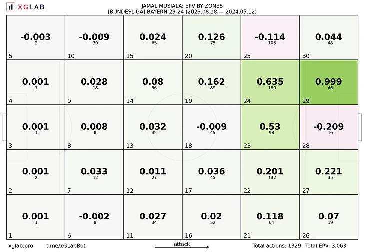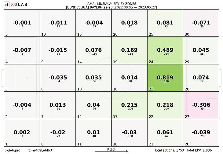 Более того, беглого взгляда на показатели EPV (ожидаемая ценность владения) хватит, чтобы понять: Мусиала научился лучше обращаться с мячом.