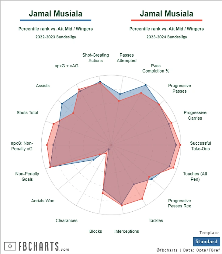 Словом, впал в прострацию, столь опасную для футболиста его возраста – возраста, в котором обыкновенно играют без задних мыслей. Вовлеченность в голевые комбинации откатилась чуть ли не до уровня сезона 2021/22. Как следствие, упала и результативность – если в 2022-ом он отметился 16-ю действиями в 15 играх, то в оставшихся 19 турах в 2023-м Мусиала набрал лишь 9 (3+6), заметно сдав на фоне остальных футболистов группы атаки.