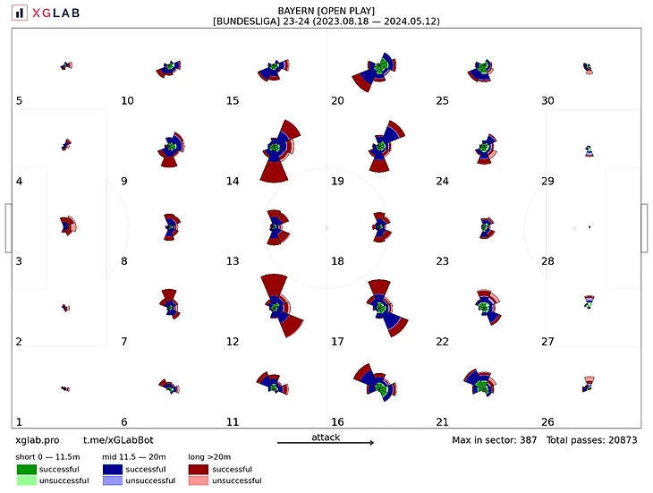 Объективных предпосылок для стерильных перекатываний мяча у «Баварии» не было никогда. Не было их и в этом сезоне. Команда, тем не менее, нередко играла вторым номером и проявляла беспомощность при попытках взлома чужой обороны. Для наглядности возьмем карту передач «Баварии» за сезон в Бундеслиге.