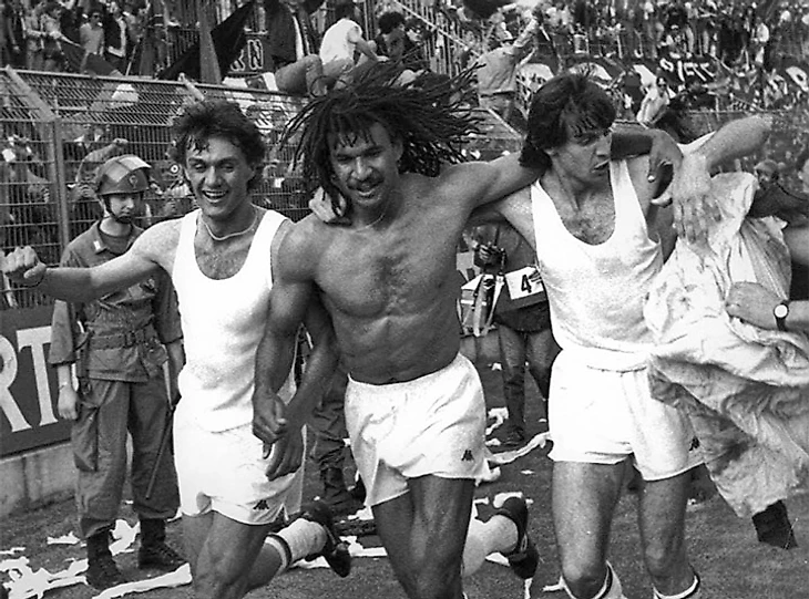 1988 год. защитник «Милана» Филиппо Галли (справа) с Руудом Гуллитом и Паоло Мальдини