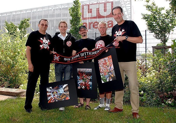 На фото 1 — вокалист Die Toten Hosen Андреас «Кампино» Фреге (справа) в игровой футболке «Фортуны» с логотипом группы на груди. Снимок сделан накануне сезона 2001/2002, по итогам которого клуб вылетел из Региональной лиги Норд в Оберлигу Нордрейн. Одновременно Die Toten Hosen, продавшие под 20 миллионов дисков и у себя на родине пользующиеся гораздо большей популярностью, чем их любимый клуб, инициировали выпуск совместной с «Фортуной» линейки мерча (на фото 2), реализация которого помогла команде хоть как-то залатать зияющие в ее бюджете дыры, и подписали контракт с местной пивоварней Diebels: часть выручки с продаж именного пива Die Toten Hosen (на фото 3) пошла на финансирование молодежного состава «Фортуны». Впрочем, этим перечень благодеяний, оказанных великодушными панками главной команде родного города не исчерпывается: еще за 13 лет до описываемых событий, в 1989-м, Die Toten Hosen пожертвовали «Фортуне» 200 тысяч марок, которые были потрачены на покупку защитника сборной Ганы Энтони Баффо (на фото 4), помогшего команде победить в турнире второй Бундеслиги и ненадолго подняться в первую. Когда без малого тридцать лет спустя клуб вновь продрался в элиту, Кампино с коллегами отпраздновали это событие грандиозным бесплатным концертом на главной площади Дюссельдорфа