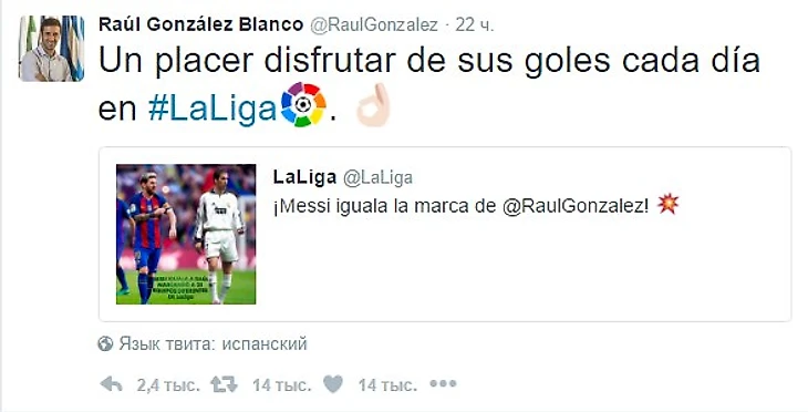 Хвалит Месси («Одно удовольствие наслаждаться его голами каждый день»).